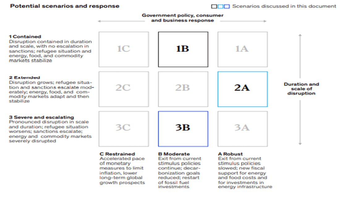 Looking at this from an economics and future perspective, as everyone would like a crystal ball at this moment in time, McKinsey’s recent paper (see resources below) in March 2022 set out three scenarios from the point of two critical dimensions: