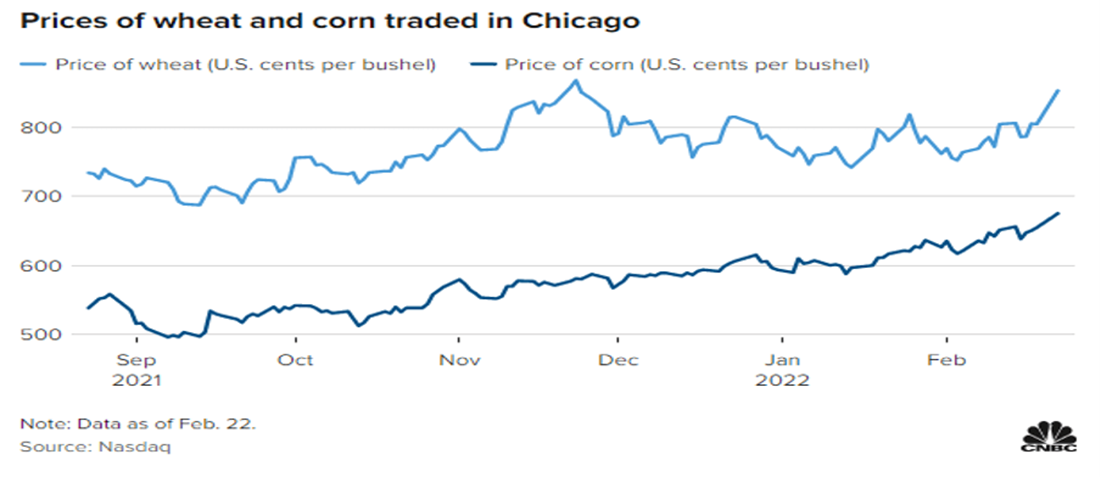 Ukraine produces wheat, barley and rye that much of Europe & MENA relies upon, with a prolonged conflict likely to create bread shortages.